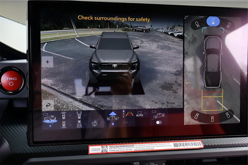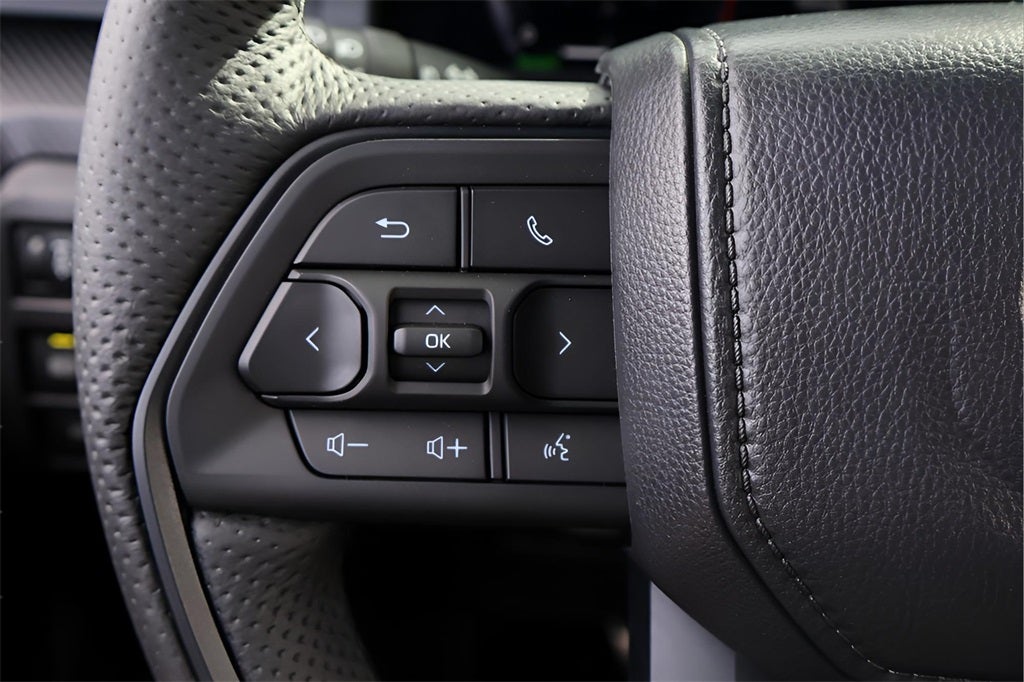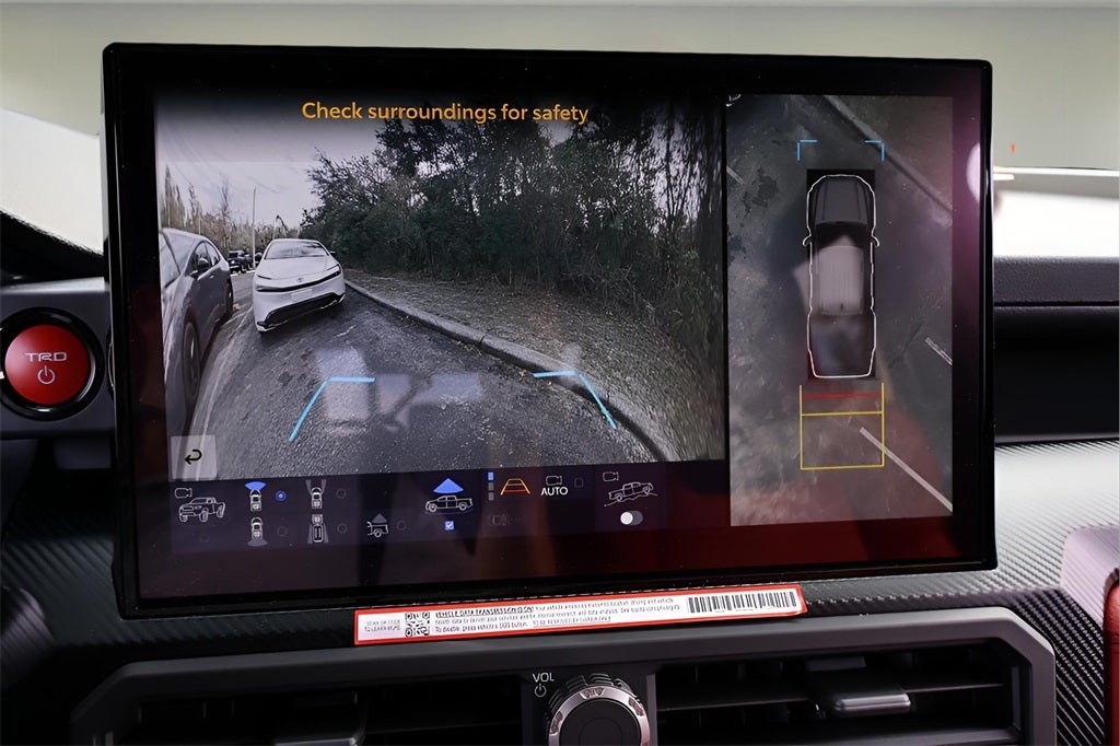 - TRD Pro leather-trimmed manual tilt/telescopic steering wheel with TRD badge, red center stripe, and phone, audio, display/infotainment, and Driver Assist controls
