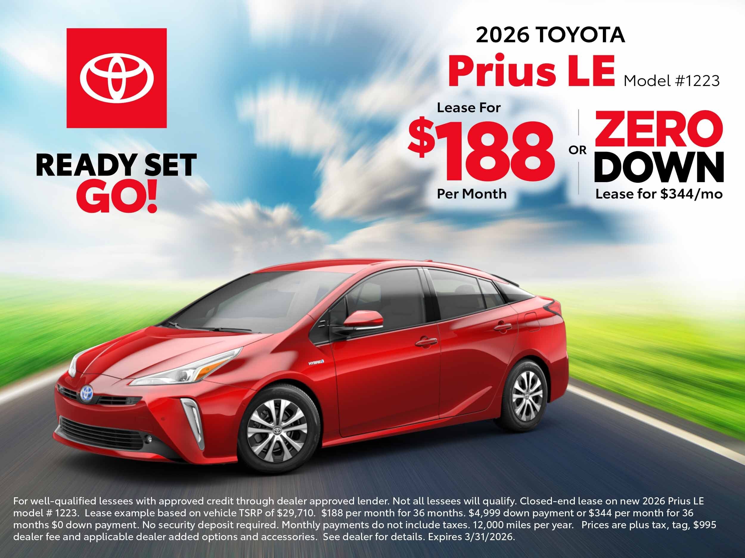 For well-qualified lessees with approved credit through dealer approved lender. Not all lessees will qualify. Closed-end lease on new 2026 Prius LE model # 1223. Lease example based on vehicle TSRP of $29,710. $188 per month for 36 months. $4,999 down payment or $344 per month for 36 months $0 down payment. No security deposit required. Monthly payments do not include taxes. 12,000 miles per year. Prices are plus tax, tag, $995 dealer fee and applicable dealer added options and accessories. See dealer for details. Expires 3/31/2026.