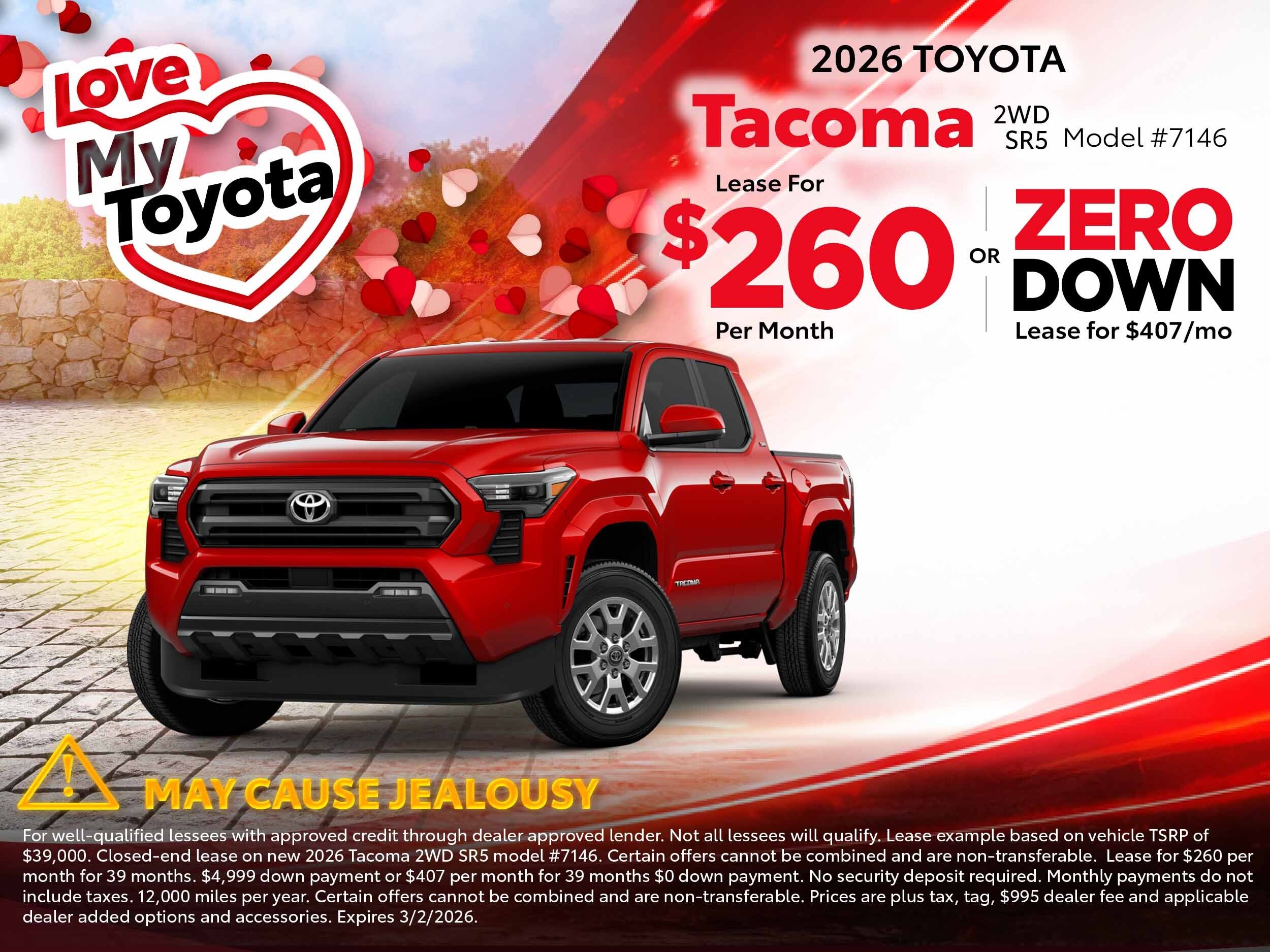 For well-qualified lessees with approved credit through dealer approved lender. Not all lessees will qualify. Lease example based on vehicle TSRP of $39,000. Closed-end lease on new 2026 Tacoma 2WD SR5 model #7146. Certain offers cannot be combined and are non-transferable. Lease for $260 per month for 39 months. $4,999 down payment or $407 per month for 39 months $0 down payment. No security deposit required. Monthly payments do not include taxes. 12,000 miles per year. Certain offers cannot be combined and are non-transferable. 2.49% APR for 36 monthly payments of $28.86 for every $1,000 financed. Terms available on approved credit through participating Toyota dealers and Southeast Toyota Finance. For only very well qualified customers. Prices are plus tax, tag, $995 dealer fee and applicable dealer added options and accessories. Expires 3/2/2026.