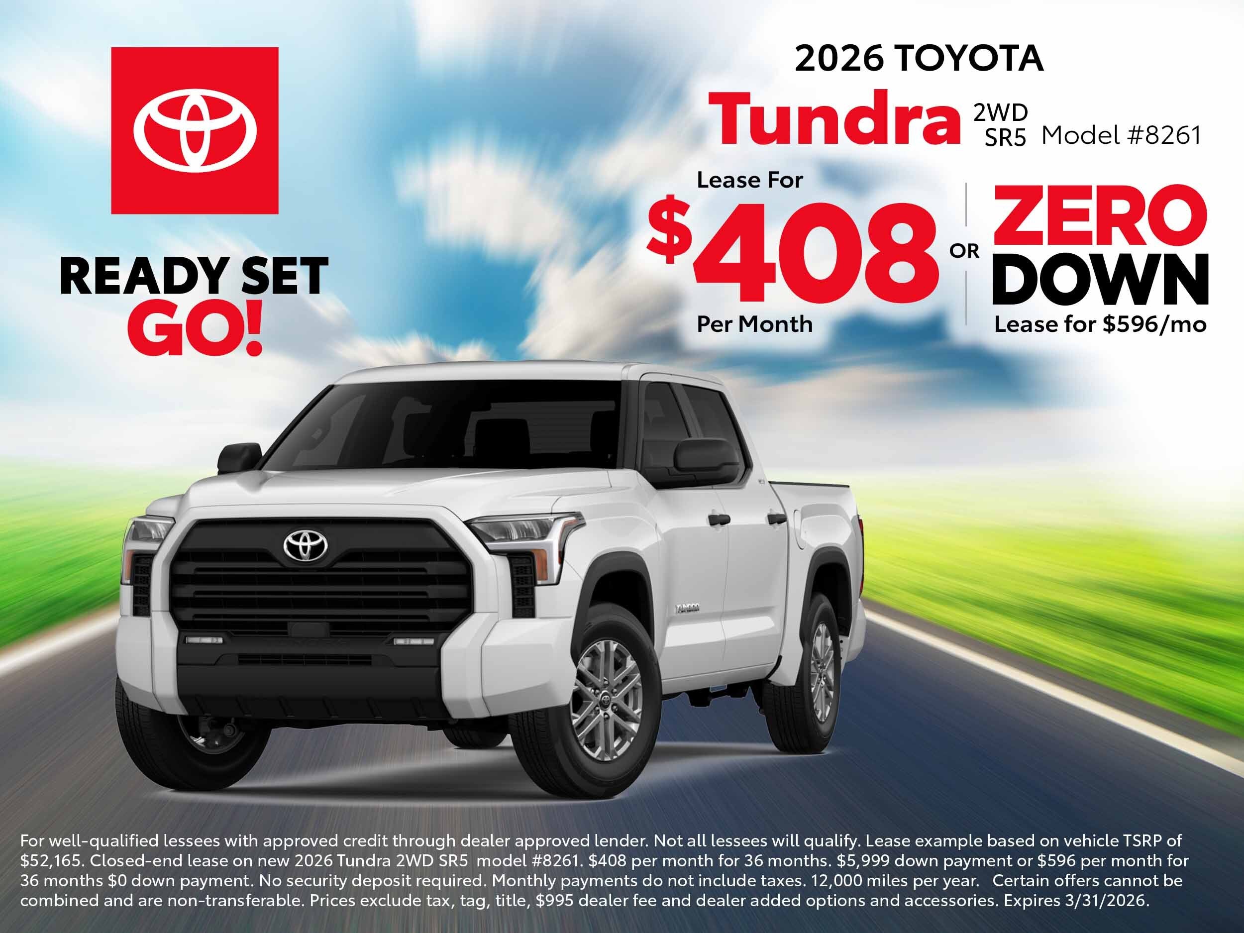 For well-qualified lessees with approved credit through dealer approved lender. Not all lessees will qualify. Lease example based on vehicle TSRP of $52,165. Closed-end lease on new 2026 Tundra 2WD SR5 model #8261. $408 per month for 36 months. $5,999 down payment or $596 per month for 36 months $0 down payment. No security deposit required. Monthly payments do not include taxes. 12,000 miles per year. Certain offers cannot be combined and are non-transferable. Prices exclude tax, tag, title, $995 dealer fee and dealer added options and accessories. Expires 3/31/2026.